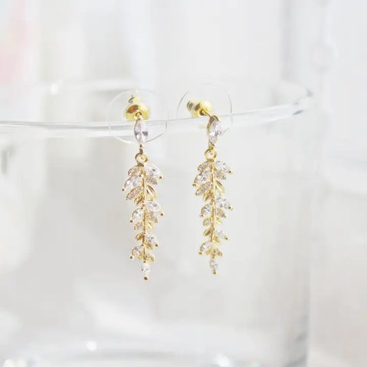 Gold and Crystal Willow Leaf Dangle Drop Earrings
