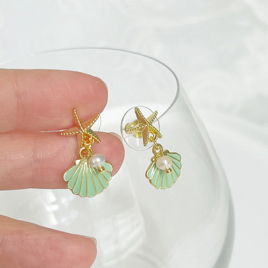 Gold Starfish and Green Seashell with Mini Pearl Drop Earring