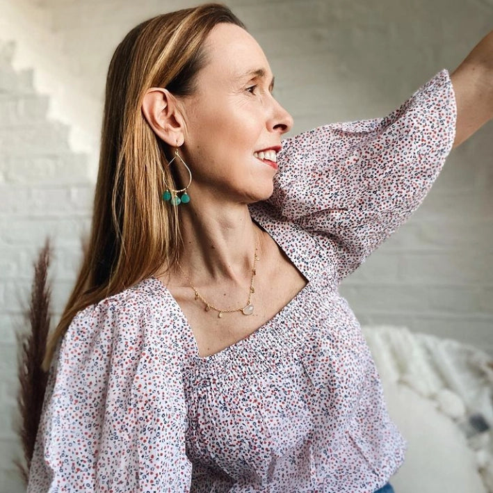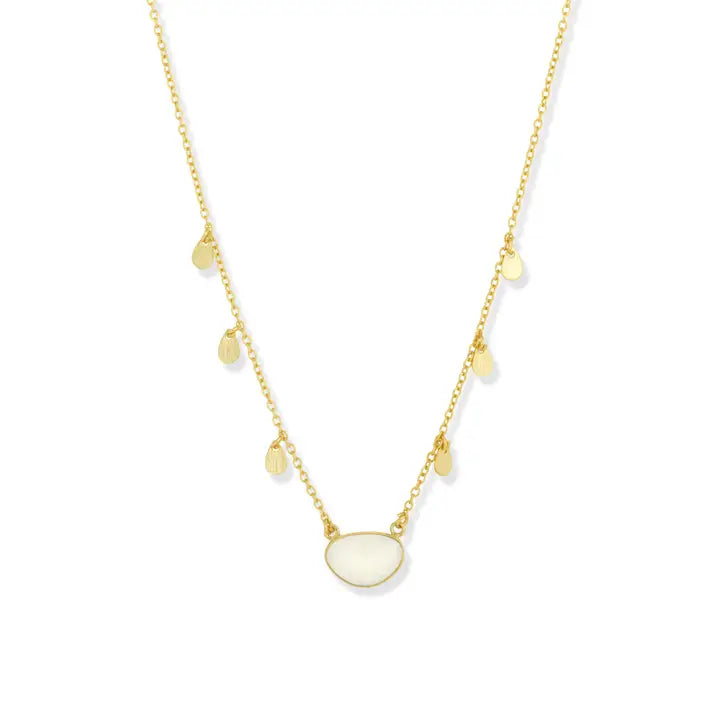 Short pendant necklace with gold charms and white chalcedony gemstone The Summer necklace is one of our signature gemstone neckalces, featuring a faceted rounded triangle cut semi precious stone. The chain is adorned with tiny gold petals to give a delicate movement to this short pendant necklace.